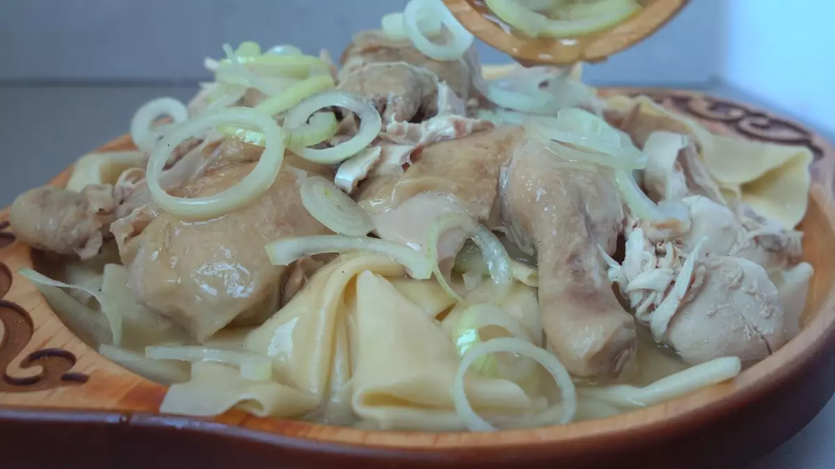Кусочки вареной курицы и выкладывают на на готовые сочни: YouTube / Дастархан — вкусные рецепты Сваренную курицу разделайте на кусочки. Выложите ее поверх отваренного теста. Сверху полейте курицу оставшимся луковым бульоном и подайте блюдо к столу. Также существует способ подачи, когда бульон подают к столу отдельно в пиалах.