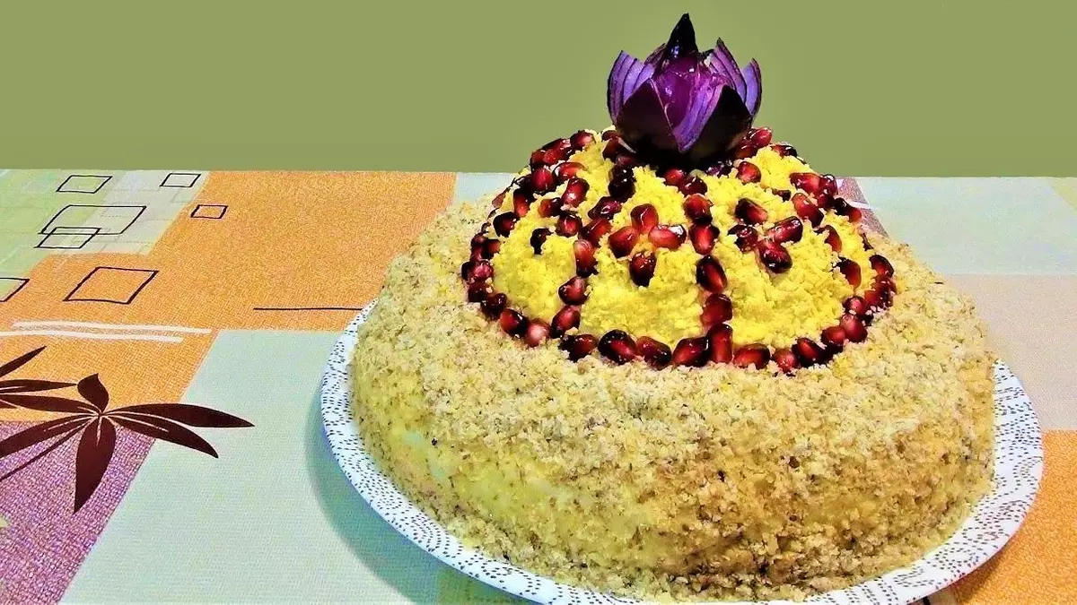 Вершину украшают желтками и гранатовыми зернами: YouTube / Кухня Садовода Лопаткой или кухонным шпателем, придайте салату форму шапки. Основу сделайте диском высотой до 5 см. Вершину шапки сформируйте полусферой.