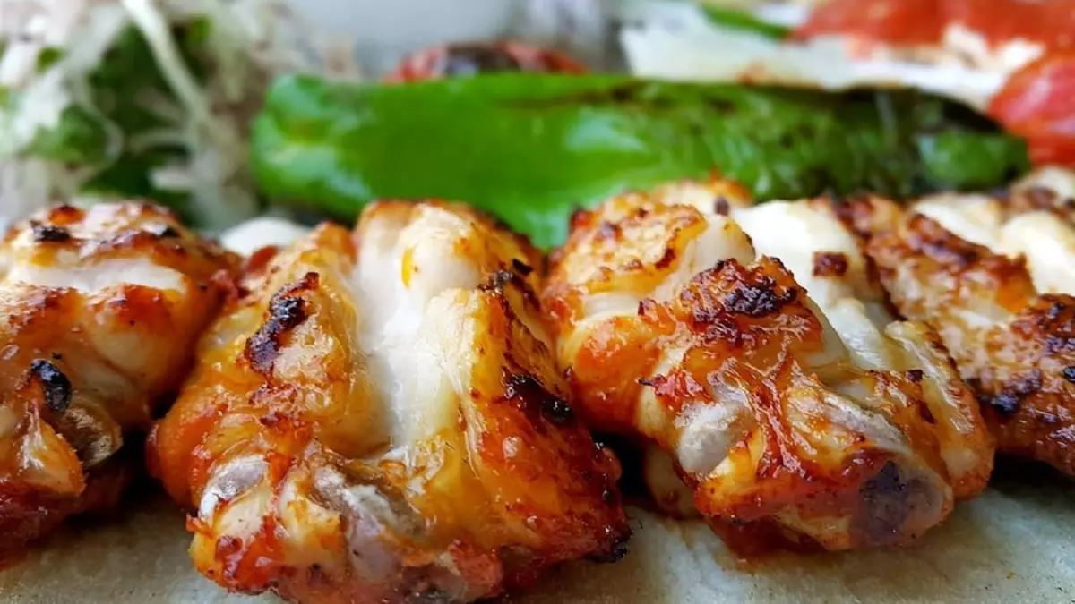 Приготовьте курицу на углях: YouTube / ОХ И ВКУСНО Очистите курицу от маринада. Если это не сделать, он быстро подгорит и шашлык получится невкусным. Наденьте мясо птицы на шампуры или уложите на складную решетку. Готовьте на горячих углях 25–35 минут. Шашлык переворачивайте каждую минуту, чтобы он прожарился равномерно.