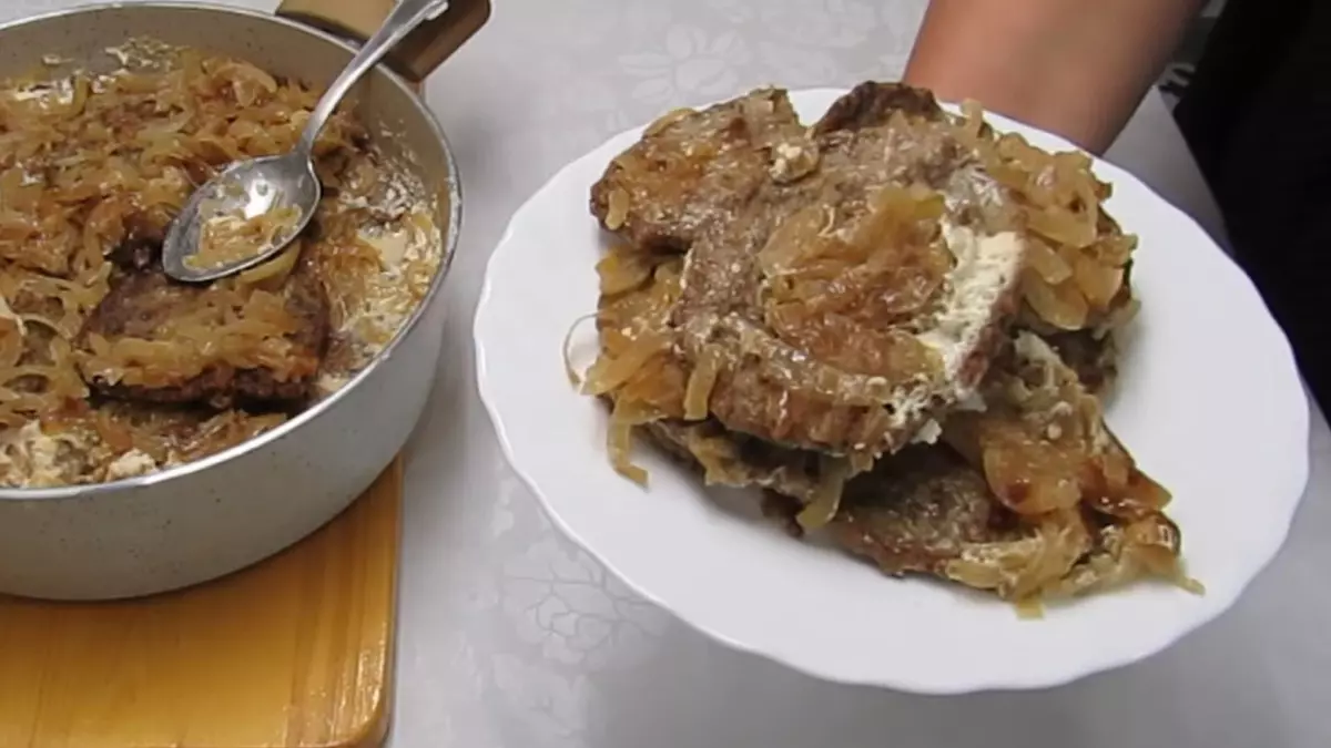 Оладьи и лук складывают слоями в кастрюлю: YouTube/ Вкусный уголок. Выложите в широкую кастрюлю один слой печеночных оладий. Сверху разложите часть обжаренного лука. Чередуя слои, выложите в кастрюлю все оладьи и лук.