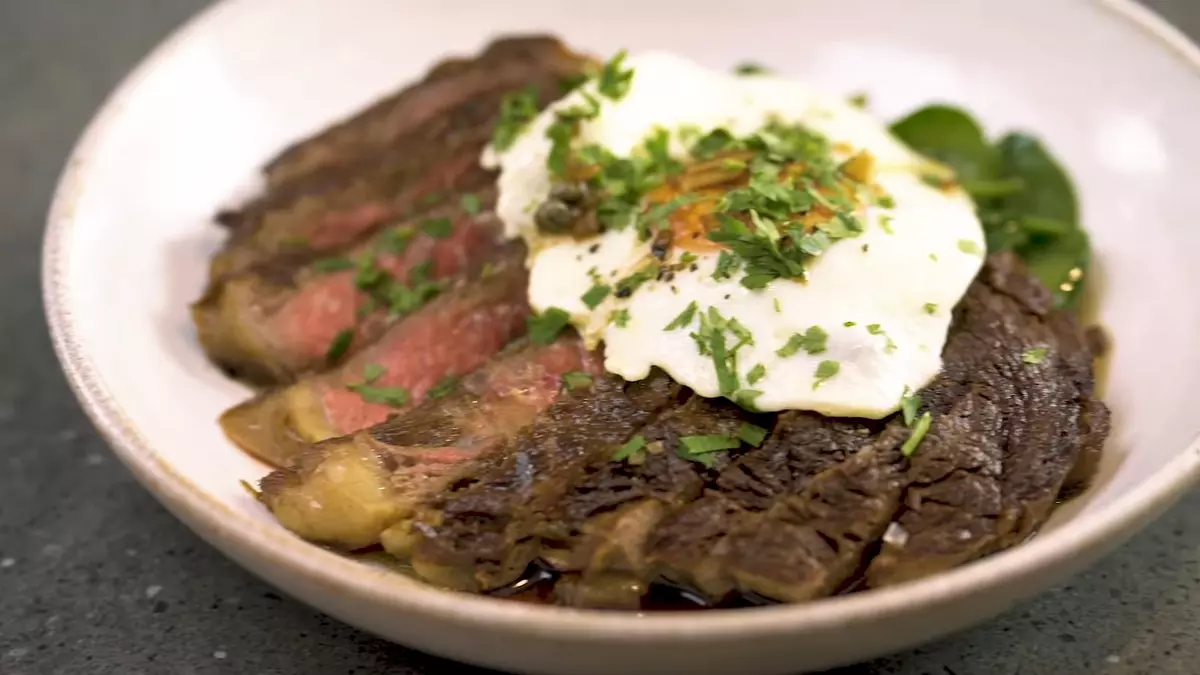 Жареное яйцо и заправку с каперсами выкладывают на мясо: YouTube/ Chef Tom Kerridge Шпинат выложите на сервировочную тарелку. Бифштекс нарежьте слайсами толщиной 1,5–2 см. Нарезанный бифштекс положите поверх шпината. Аккуратно переложите яйцо на мясо. Добавьте в блюдо немного ароматной заправки, в которой жарился шпинат.
