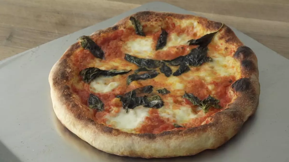 Пиццу подрумянивают на решетке под грилем: YouTube/ Brian Lagerstrom Поместите пиццу на раскаленный камень и выключите огонь в духовке. Включите верхний гриль на полную мощность. Через 4–5 минут проверьте дно пиццы, оно должно хорошо подрумяниться и принять форму. Переложите пиццу с камня на верхнюю решетку духовки примерно на 15 см ниже жаровни. Поверните ее примерно через 30 секунд. Через 1 минуту пицца хорошо подрумянится и будет готова к употреблению. Повторите процедуру формовки и выпекания пиццы с оставшимися порциями теста.