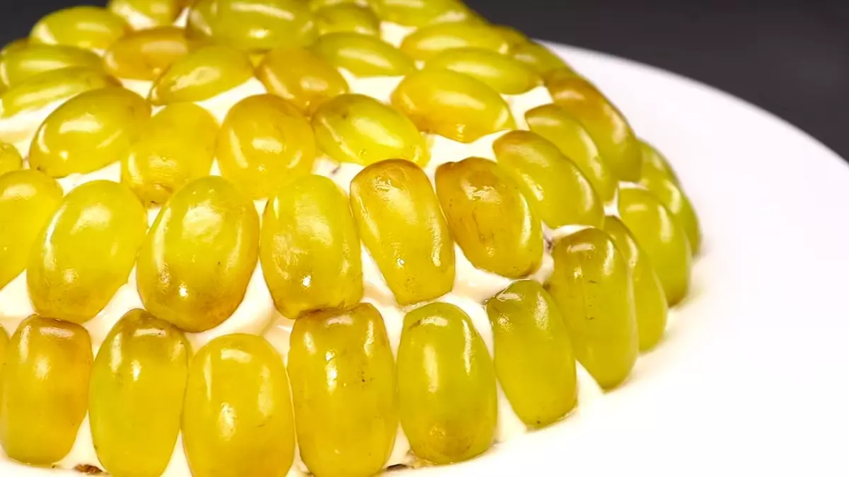 Салат украшают половинками виноградин: YouTube / Это просто Разгладьте поверхность салата ложкой или кулинарным шпателем. При необходимости поправьте форму: у классического салата она куполообразная и напоминает плафон настольной лампы. Поверх кругами, начиная снизу, выложите половинки виноградин выпуклой стороной кверху. Закройте виноградом всю поверхность салата. Готовый салат отправьте в холодильник на час пропитываться, а затем подавайте.