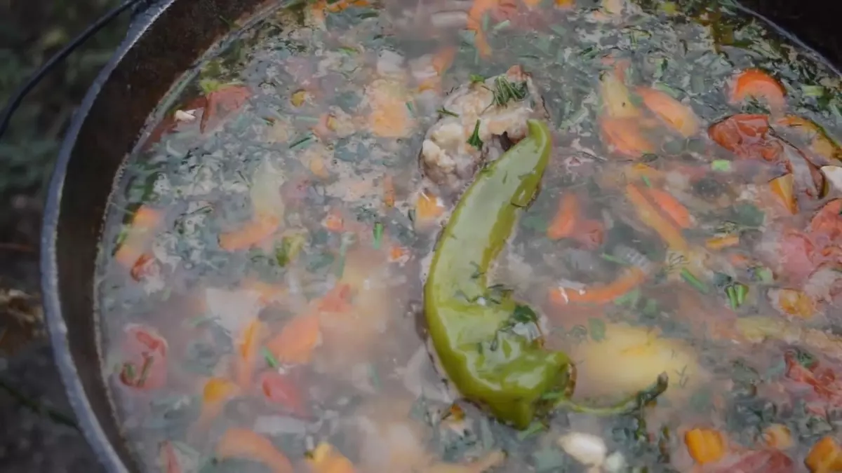 В суп добавляют нарезанный сладкий перец: YouTube/ И МЯСО И РЫБА Спустя 30 минут добавьте в казан помидоры и сладкий перец. Также положите 1 острый перец целиком. Добавьте соль и черный молотый перец по вкусу. Варите суп еще 30 минут.