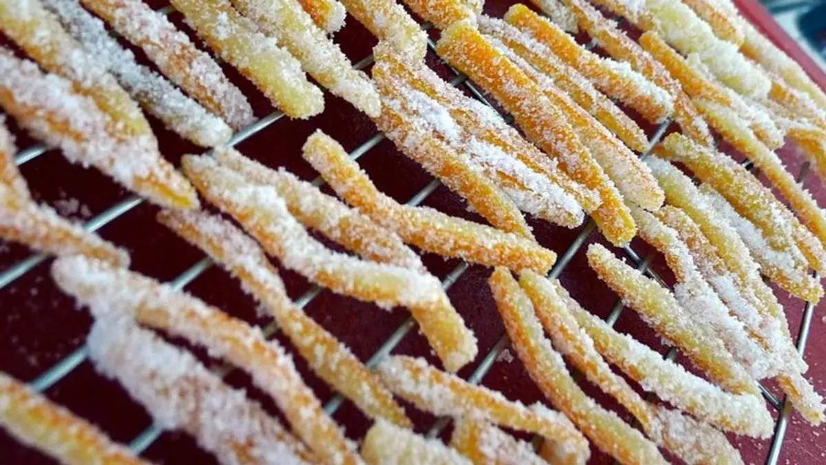 Высушите цукаты: YouTube / Готовим с Милой Барси Застелите пергаментом решетку из духовки. Разложите на бумаге приготовленные цукаты и оставьте сушиться при комнатной температуре на сутки. Переверните цукаты на другую сторону и сушите еще 24 часа.