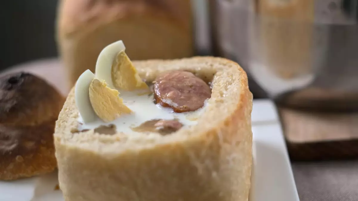 Суп наливают в хлеб и добавляют сваренное яйцо: YouTube/ FermXpert Подают суп в глубокой тарелке, однако гораздо интереснее он выглядит в своей традиционной подаче — в хлебе. Для этого с хлеба срезают верхушку, из середины аккуратно вырезают мякоть. Чтобы «посуда» не протекла, внутреннюю сторону хлеба смазывают яйцом и запекают в духовке около 10 минут. Журек наливают в съедобную тарелку, сверху кладут половинку сваренного вкрутую яйца и подают к столу.