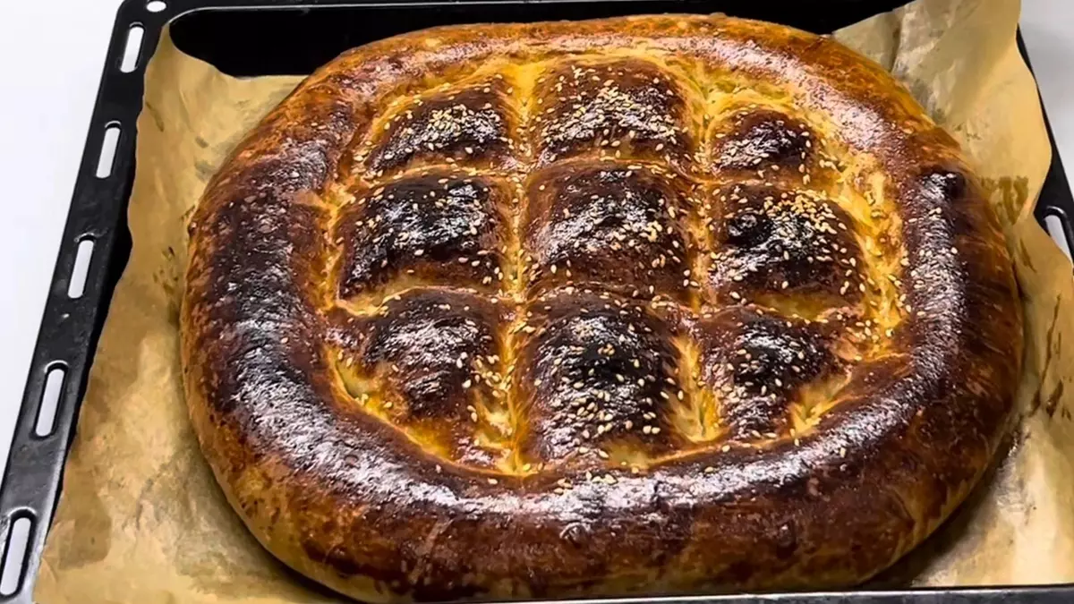 Пальцами придаю хлебу необходимую форму: YouTube/ Anargul Muxtarovna Когда тесто поднялось во второй раз, снимаю целлофан. Пальцами придаю лепешке форму, проведя бороздки сначала вдоль бортика, а затем по центру пласта. Смазываю заготовку желтком и посыпаю кунжутом.