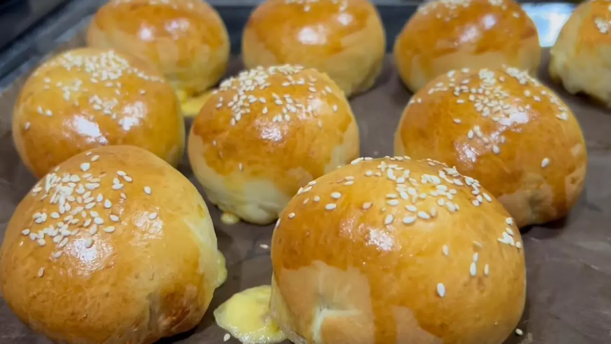 Смазываю булочки смесью желтка и молока: YouTube/ Nariman Ariana Застилаю противень пергаментом и выкладываю на него заготовки швом вниз. Перед выпеканием смазываю их смесью 1 желтка с 1 ст. л. молока и посыпаю кунжутом. Выпекаю булочки-чизбургеры в разогретой до 180 °C духовке 15–20 минут.