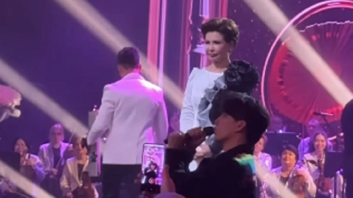 На кадрах видно, как Димаш Кудайберген поздравляет Розу Рымбаеву. В своей теплой речи он назвал ее примером для всех поколений артистов и учителем артистов. Он пожелал Рымбаевой всего лучшего и поклонился певице в знак уважения.
