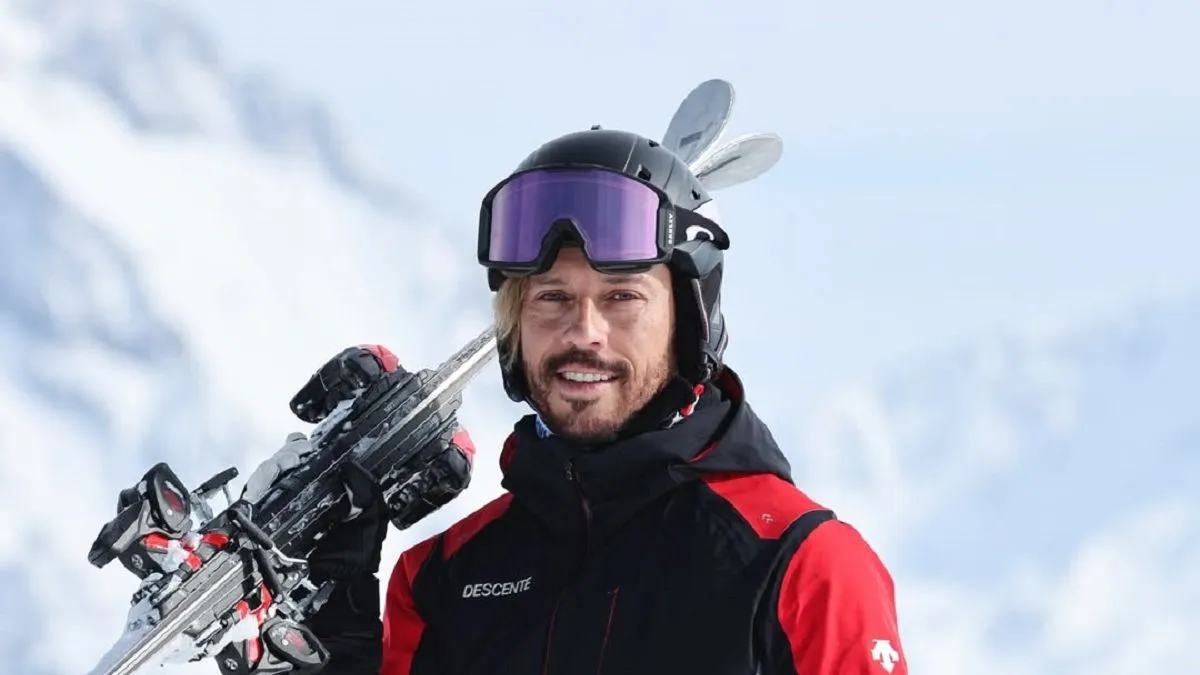 В карусели можно увидеть Максима Галкина в горнолыжном костюме и шлеме, позирующего на фоне снежных гор с лыжами в руках, а также его фото в светлом костюме.