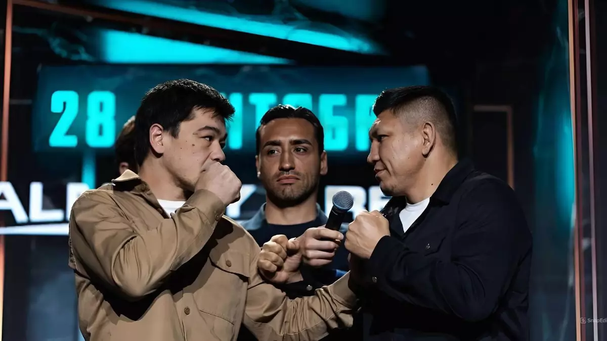 Казахстанский боец смешанных единоборств Куат Хамитов провел битву взглядов перед боем по правилам бокса с Нурбергеном Шариповым, передает NUR.KZ.
