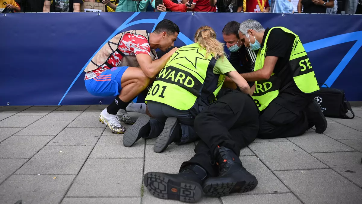 После попадания мяча в голову женщина-стюард упала, и к ней подбежали коллеги. Роналду почувствовал себя виноватым и пришел лично осведомиться о состоянии работницы стадиона. Ее привели в чувство, и тогда Роналду вернулся к разминке.