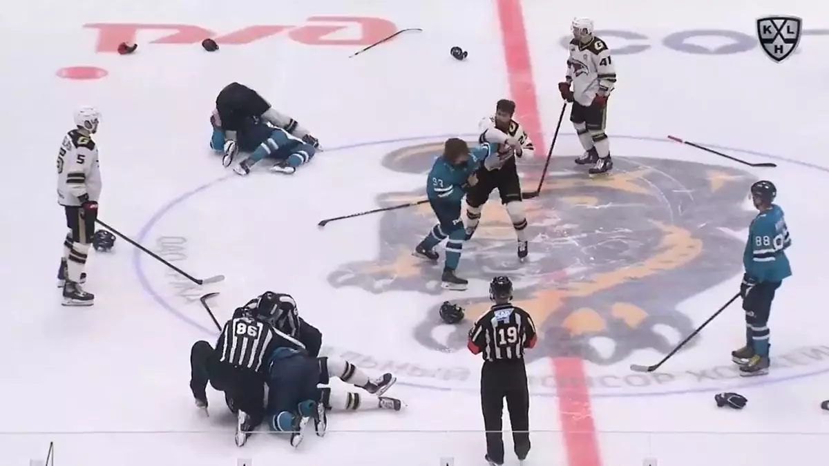 Шесть хоккеистов в матче КХЛ начали драку сразу после стартового вбрасывания