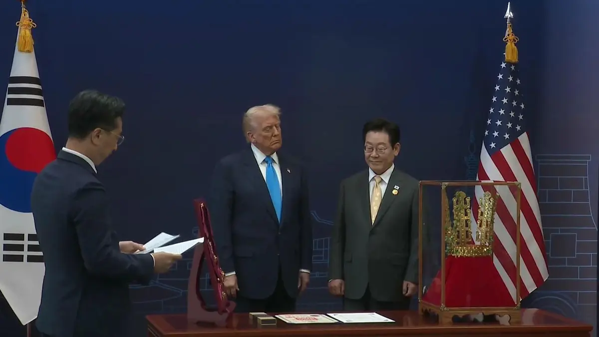 Президент США Дональд Трамп прибыл с визитом в Южную Корею, где в знак признания его заслуг в деле установления мира на Корейском полуострове ему вручили орден и копию золотой короны.